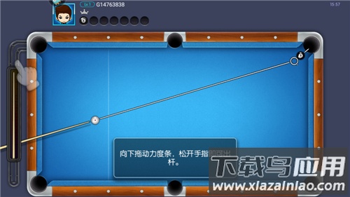 击球:拖动球杆调整方向并点击确认,随后向球杆反方向拖动以控制红色力度条,松开手指即可出杆。