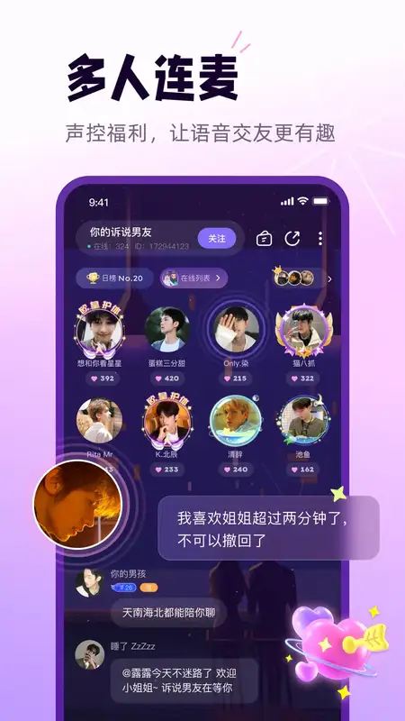 2、支持多样化的语音聊天模式,大量用户实时在线陪伴;既可进行一对一私密交流,也能无障碍畅快交友。