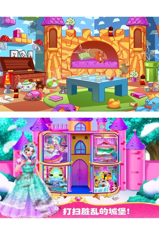 欢迎小朋友们加入打扫城堡房间的行列!在宏伟的皇家城堡里,你需要将每一个凌乱的房间恢复整洁。协助美丽善良的小公主修补房屋,清扫各个角落,整理散落的衣物与玩具,最后还能重新设计装修城堡,让它变得更加漂亮。让我们先从公主的卧室开始吧!擦去灰尘,拖净地板,将玩具和衣物归位。做得真棒!公主的卧室又变得和从前一样可爱迷人了。