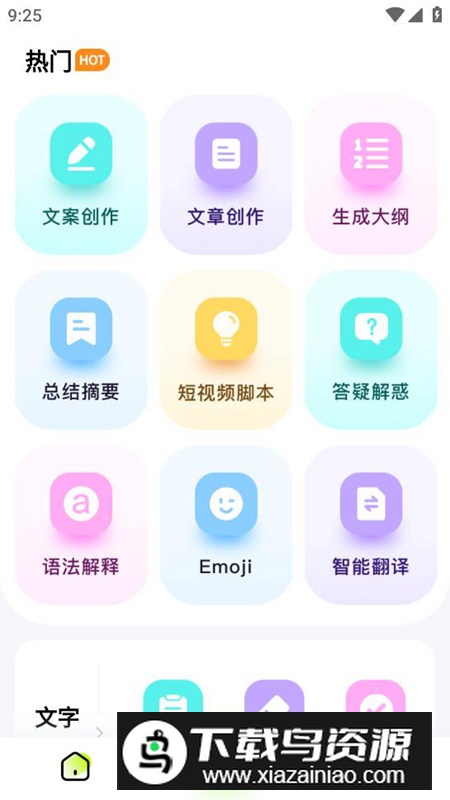 该软件主要提供以下十项核心服务:文案撰写;文章原创;内容总结与摘要;语法分析与解释;短视频脚本构思;Emoji表情应用;生成内容大纲;各类问题解答;多语言智能翻译;以及通用文字创作。