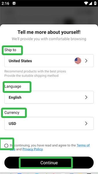 2. 设置收货地址、首选语言、通用货币等信息,填写完毕后勾选同意隐私政策,点击继续进入下一步。