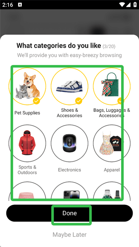 3. 选择您经常采购的商品类别,然后点击完成进入登录步骤。