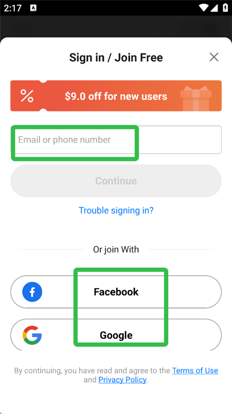4. 用户可以使用电子邮箱或手机号码注册登录,也可以直接通过facebook或谷歌账号登录。