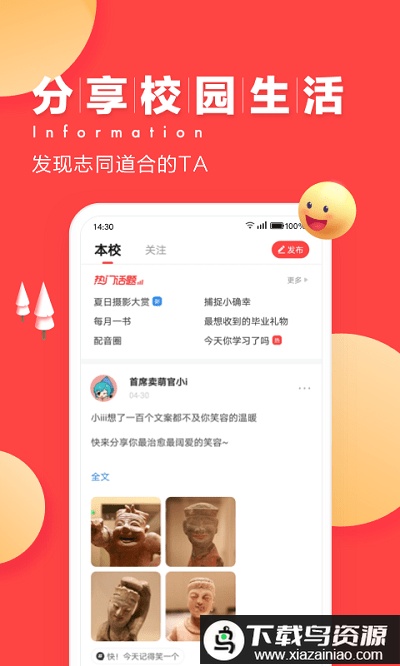 6、校园热门资讯:聚合来源丰富、质量较高的校园图文、短视频及音频内容,推荐来自视频网站、公众号、社团及校园达人的原创作品。