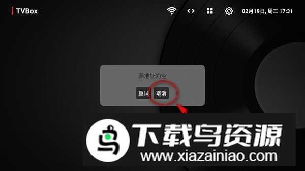 启动TVBox后,若出现“源地址为空”的提示,点击“取消”即可。