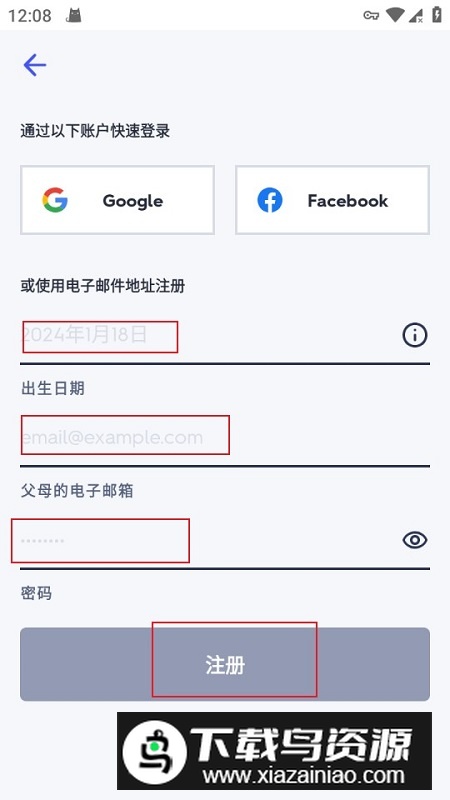 2、接着依次填写电子邮箱、出生日期、家长邮箱并设置密码,最后点击注册即可完成;