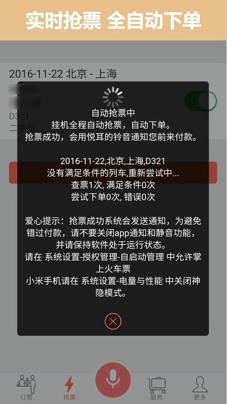 设置好出行日期与车次后,可实现全天候自动抢票;系统提供多种购票策略组合,增加成功概率;抢票结果会通过消息及时通知,无需用户一直守在手机前。