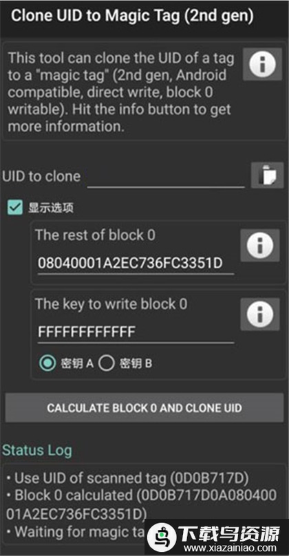 在“The key to write block 0”处填写目标卡具备写入权限的密钥(keyA或keyB);新卡通常默认密钥为FFFF……,且密钥A与密钥B均拥有写入权限;若密钥不正确,可通过“读标签”功能读取目标卡数据以查看具体密钥。