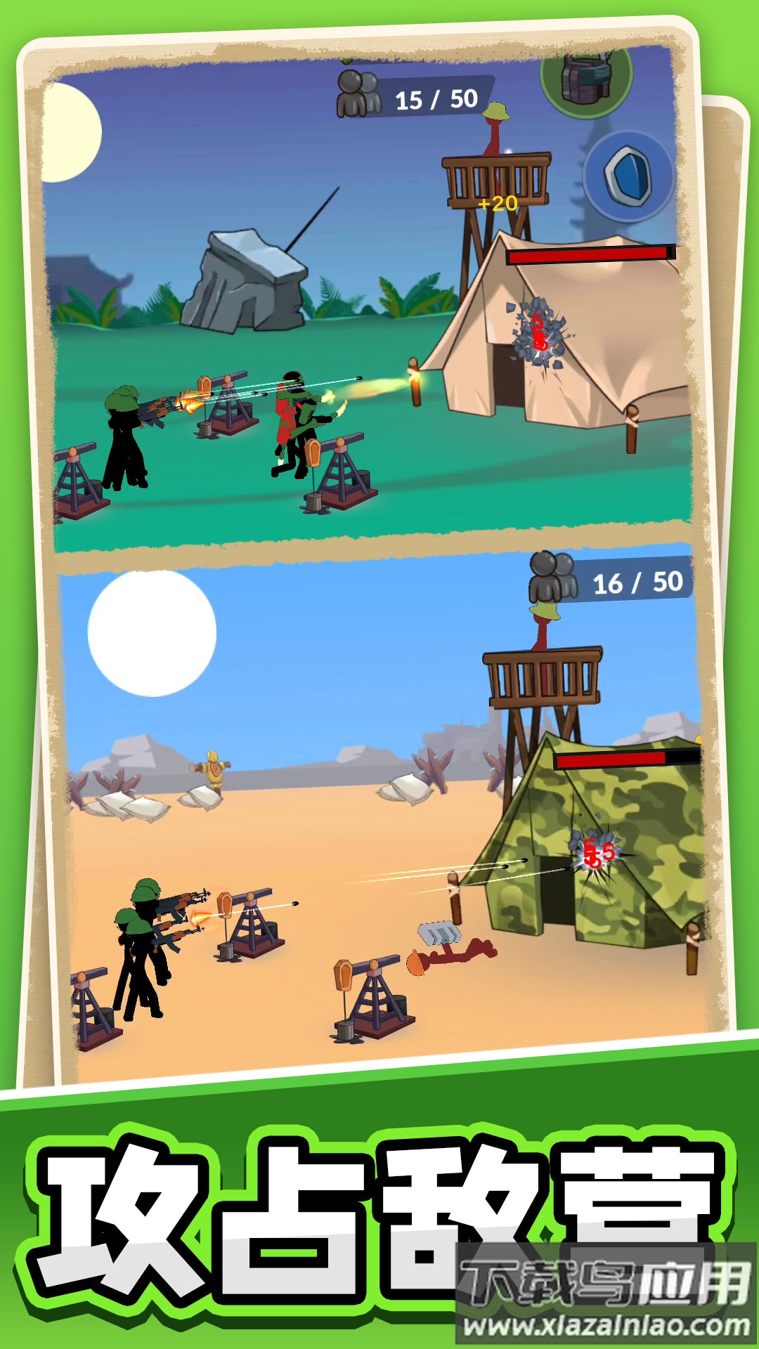 3、满足你对闯关的追求,解锁更多类型的火柴人士兵,根据战局进行灵活搭配。