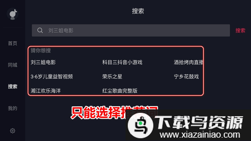 搜索功能仅支持选择预设关键词,无法调用键盘输入自定义词汇。