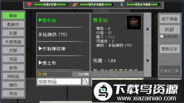 3、进入武器栏装备初始枪支;角色可携带多类武器,并能使用消耗品与食物补充状态。