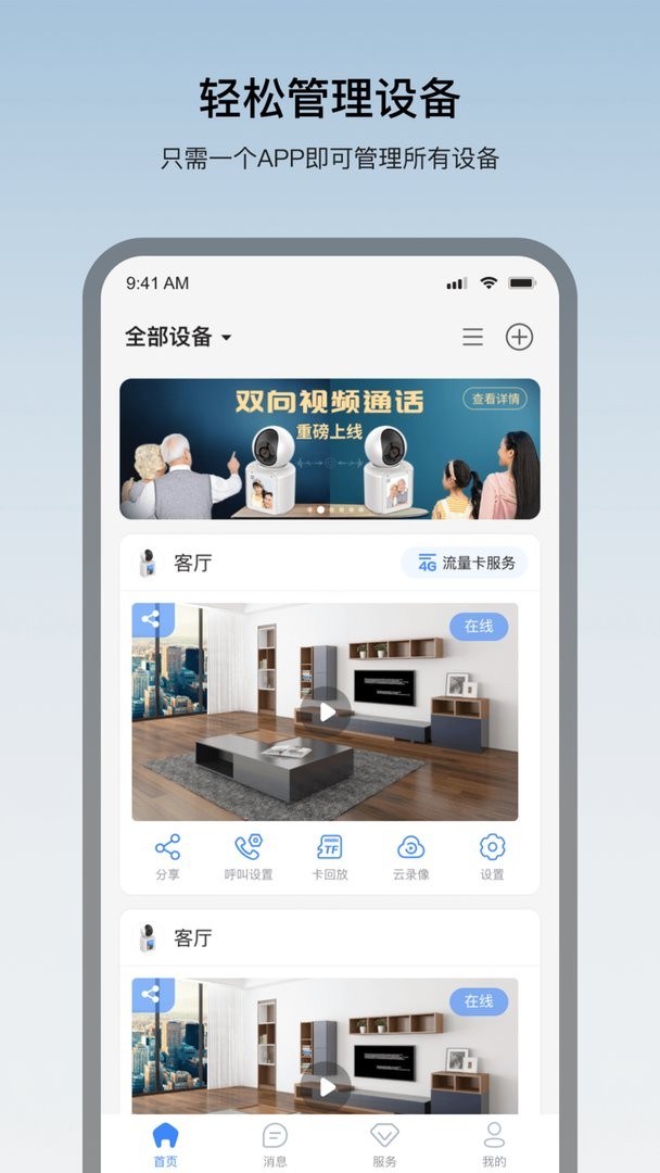 应用还集成了便捷的双向视频通话功能,让您能轻松与家中不会使用手机的老人或孩子进行沟通。