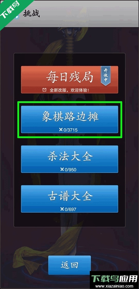 进入挑战界面,选择“象棋路边摊”选项,即可来到残局挑战环节;