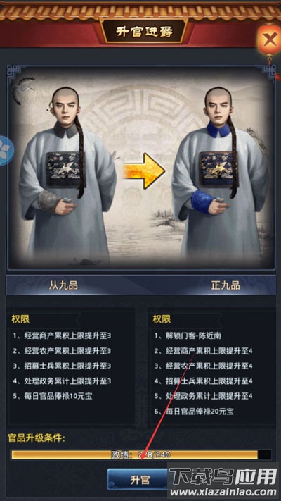 政绩是升官进爵的核心条件,在【升官进爵】页面消耗政绩即可提升官职;