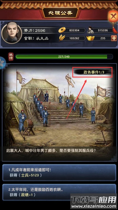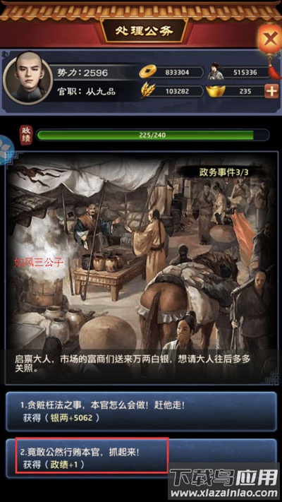 3、进入【处理公务】界面,面对政务事件时选择正确选项即可获得政绩;