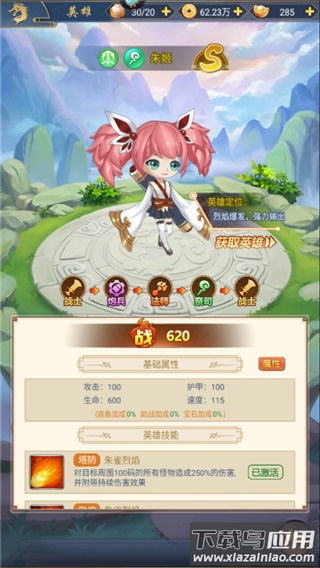 回合战斗主动技能朱雀烈焰:对敌方后排单体造成200%伤害,附加禁疗效果,持续2回合;