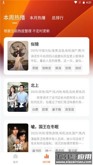 3、软件内置热播榜单,包括本周、本月及总排行等不同维度的排名;