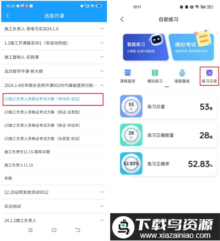 拥有学习计划的学员若需备考或巩固,可点击“自助练习”图标;选择“模拟考试”或“模拟练习”后,根据开课内容进行答题训练;练习记录可在相应页面中查看。