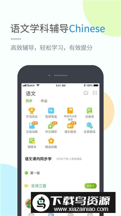 2. 语文辅导提供11项功能特权:作业辅导、汉语词典、字词闯关、笔画笔顺、句子仿写、作文宝典、课内同步学、老师作业、课文跟读、名家朗读及汉字听写;
