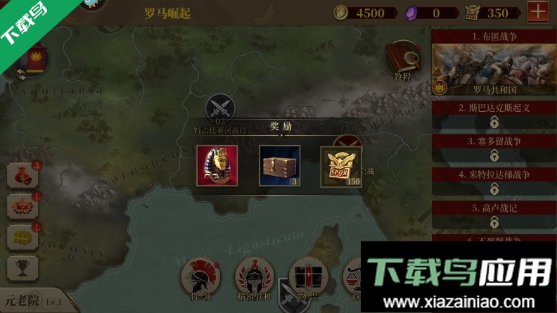 游戏初期围绕战役、征服与元老院三大模块展开,后续将逐步解锁英雄传奇篇章。这些战役均基于真实历史事件设计,每个关卡都重现了一段过往。新手引导会详细介绍基础操作,包括主次目标设定以及部队的移动与攻击方式。推进关卡需完成主要目标,次要目标则提供额外奖励,可根据当前军队状态与资源需求选择是否挑战,无需强行追求。