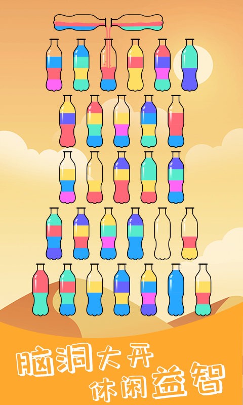 这款游戏的核心玩法是将杯子里的水按颜色分开,目标是把所有液体归类,使每个容器内只有单一颜色。初期关卡较为轻松,但随着进程深入,颜色种类和瓶子数量会增加,非常考验玩家的顺序规划和逻辑推理能力。