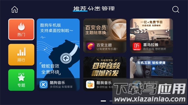 1、启动车机桌面的应用进入首页,菜单包含推荐、分类、管理及搜索。首页展示热门精选内容,左侧设有热门排行、新品榜单及专题区域,适应不同下载需要;