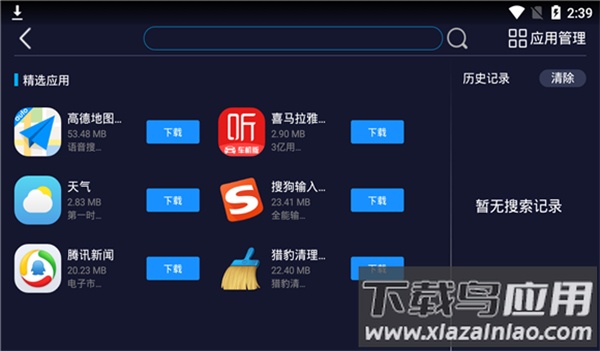 5、点击搜索图标进入搜索页,支持输入文字或拼音查找车机应用,搜索框下方有推荐应用,右侧保留历史记录与清除功能,帮助轻松找到所需软件。