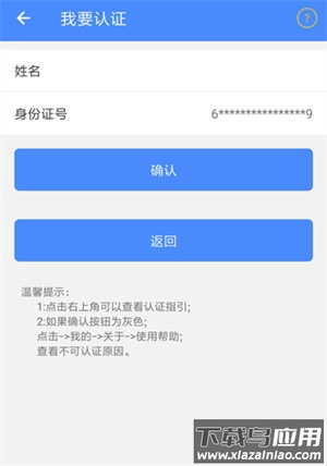 在认证页面输入姓名与身份证号码,点击确认前可查看右上角帮助了解详细流程。