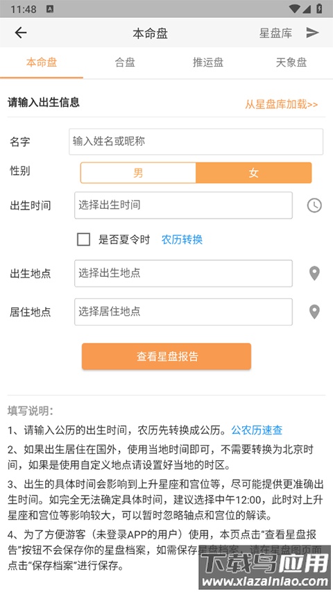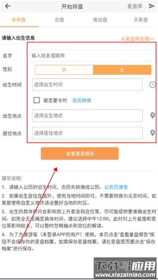 2、填写个人出生信息,包括姓名、性别、出生时间与地点等,完成后点击查看星盘报告;