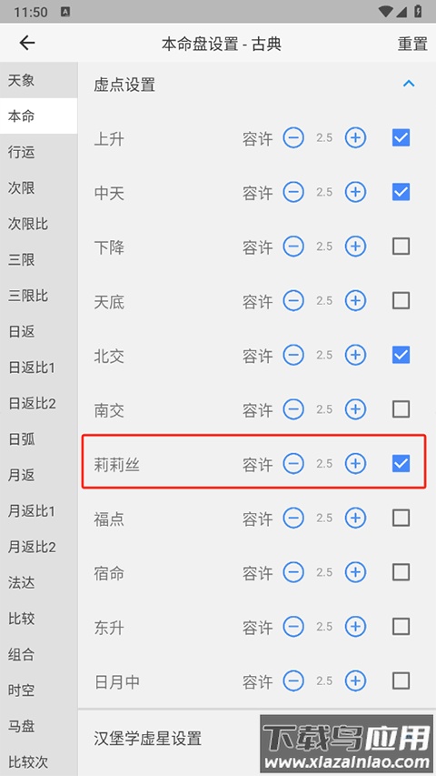 4、于本命盘设置中找到莉莉丝选项并将其勾选开启;