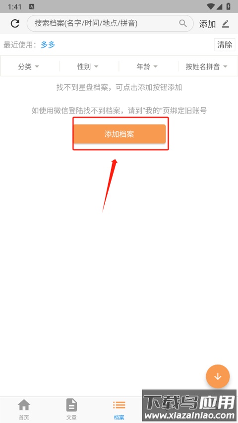 1、进入应用档案界面,点击添加档案选项;