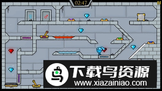 2.冰人进入火焰或火人踏入冰潭都会结束游戏,同时无法收集属于对方的宝石;