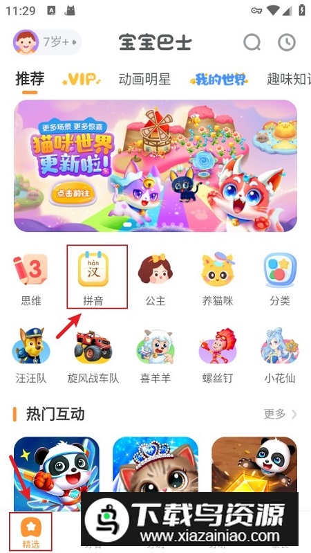 3. 登录成功后,在“精选”栏目中找到“拼音”学习板块;
