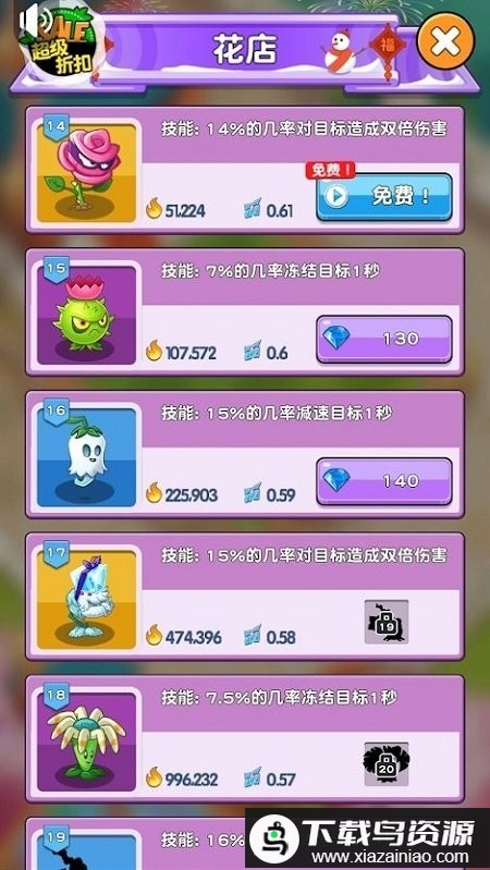 2、游戏内共有49种功能各异的植物,你可以收集金币购买蜗牛等多种实用道具,增强你的防御能力;