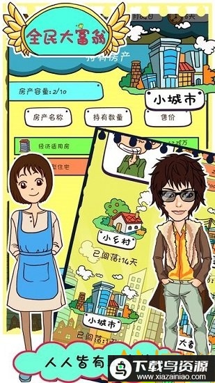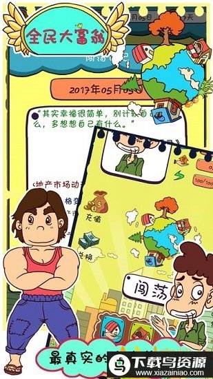 1、画面简洁可爱,带有夸张的漫画表情,让你在游戏中踏上首富之路;