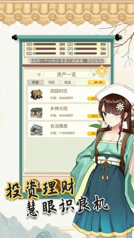 4. 你可以专注提升自身属性,力求琴棋书画样样精通,在世界线收束时获得更尊贵的称号;也能辛勤工作赚取金币,购置各类地产,成为富甲一方的人物;或是邂逅古代佳人,悉心经营情感,最终赢得芳心,成为情场赢家。
