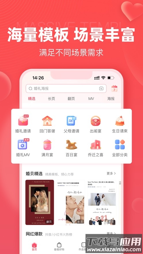 包含婚礼请柬、宝宝满月邀请、生日贺卡、同学聚会通知、老人寿宴请帖以及乔迁喜帖等多种场景的海量模板资源。