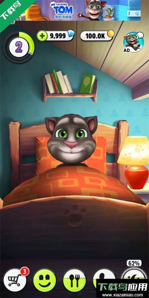 1、启动游戏后跳过开场,主界面下方设有游戏、进食、如厕、睡眠等选项,维持各项需求满足能让汤姆保持愉快心情。