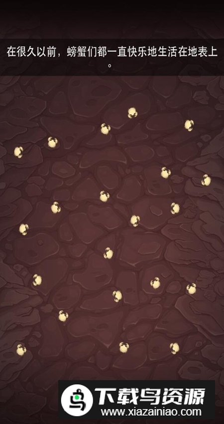 螃蟹曾在地表安宁生活;传说中巨型爬虫兽的突然降临打破了平静,它们吞噬家园,迫使蟹群潜入地底。数个世纪过去,长期受地下水晶辐射的影响,螃蟹逐渐发生异变。在抵抗辐射的过程中,它们的鳌爪与甲壳变得如水晶般锐利,似钻石样坚硬。如今,蟹群已整装待发,准备向地表发起反击。你将组建并壮大螃蟹军团,帮助它们持续进化,最终夺回故土。