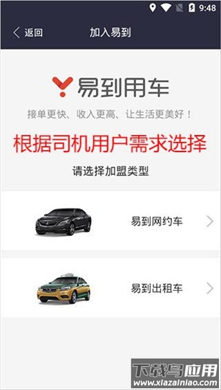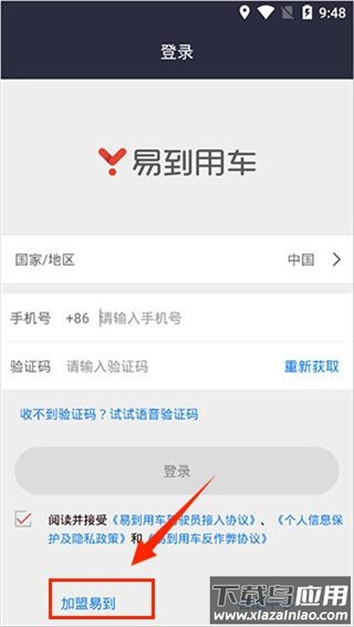 1、下载并启动易到车主端应用,在登录页面底部找到并点击“加盟易到”入口。