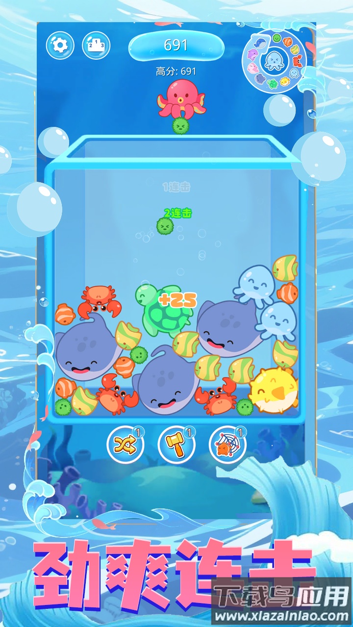 1、主题设定充满趣味,以明朗的海底画面和俏皮的海洋生物为核心亮点,与一般消除游戏区别开来,带来更具疗愈感的视觉享受。