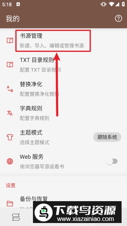 2、在【我的】界面中找到并点击【书源管理】。