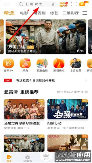 1、打开应用并登录,进入首页。首页设有精选电影电视剧、超清推荐、热播电视剧等栏目,在上方搜索框输入需要投屏的视频名称。