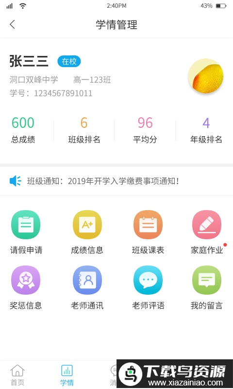 应用内设有七大功能板块,包括切换子女、快捷功能、新闻通知、学生学情、消息中心、卡务管理与个人中心。切换子女功能支持一键查看不同孩子的在校状况,适应多子女家庭的实际需求。家长可全面掌握学生的考勤、学习进度以及缴费消费信息。新闻通知与学情板块则促进了家校之间的紧密联系,让家长及时知晓班级与学校的各项动态。
