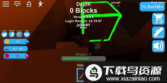 首先进入矿场,点击屏幕下方的木镐进行装备,然后点击想要挖掘的矿石,矿石周围会出现绿色边框,长按即可开始挖掘,选中目标后可以看到当前矿石的价值,最初只能挖掘价值1金币的矿石,背包满额时可携带10个矿石,总价值10金币。