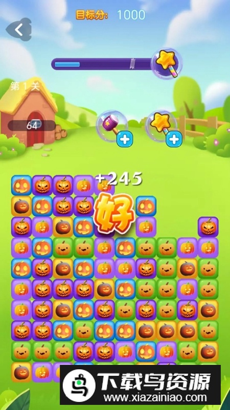 2.巧妙的关卡布局:每一关都有独特的盘面设计和通关要求,比如在指定时间内获得目标分数,或是清除一定数量的特定南瓜。