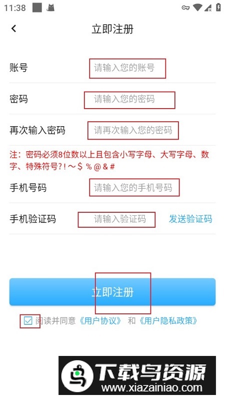 3、在注册页面依次填写账号、密码、手机号码及收到的验证码,勾选同意隐私政策后,点击“立即注册”即可完成账号创建。