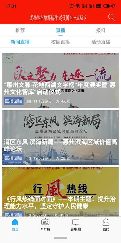 2.视听直播——呈现清晰流畅的直播与点播体验,包含惠州广电全部音视频节目资源。