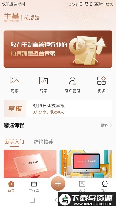该应用专注于财富管理领域的私域流量运营,支持用户创建个人财富工作室,实现移动化办公。它具备精准的名片智能识别功能,并提供多套可自定义样式与内容的名片模板。平台内拥有大量系统化海报,支持企业自主定制,同时提供视频课程等辅助工具。