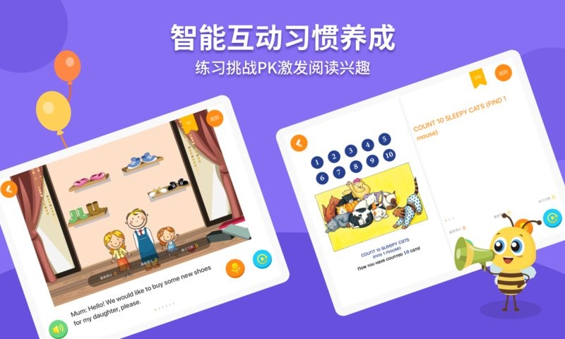 4、全方位学习手段:磨耳朵环节可聆听儿歌、绘本及口语音频;情境对应环节通过观看动画、绘本及场景画面实现理解;练口语环节则提供朗读、角色扮演及挑战PK等多种方式。